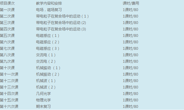 让高二学生能全面了解并适应高中物理学科的学习,基本掌握高中理科的学习方法(思维+练习+再思维+再练习+总结)。所有学生能通过课程训练达到各学校物理学科的平均水平,有半数学生能到达学校的最高水平。