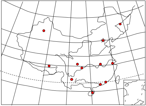 80°E、90°E、100°E、110°E、120°E