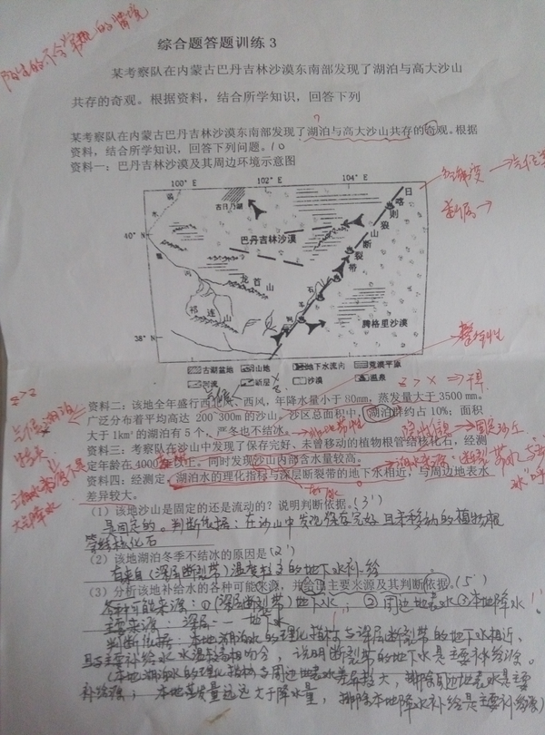 如何规范答题,使用地理术语,所有老师都会给你们讲,我这里就不说了。我要简单的说说分主次的问题,因为地理是文理兼备的学科,有些文科问题没有对不对的问题,只有主要次要的问题,当试卷分值已满,出题人设置分值时就会考虑哪些点给分哪些点不给分的问题。所以,你作答时也必须考虑这个问题。那么什么样的答案点是主?什么样的答案点是次呢?一般来说,它和别人不一样的点为主,大众化的或不说大家也都知道的点为次。譬如答黄河水文特征时,我让学生排出分点的顺序是:老大是含沙量大,老二是水量较少,老三是汛期较短,老四是冰期短。至于季节变化、年级变化就不排了。而在描述内流河的水文特征时水量的季节变化一定要放在老二的位置上的。