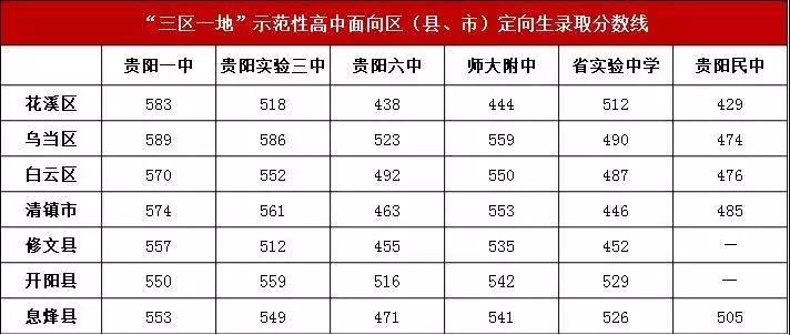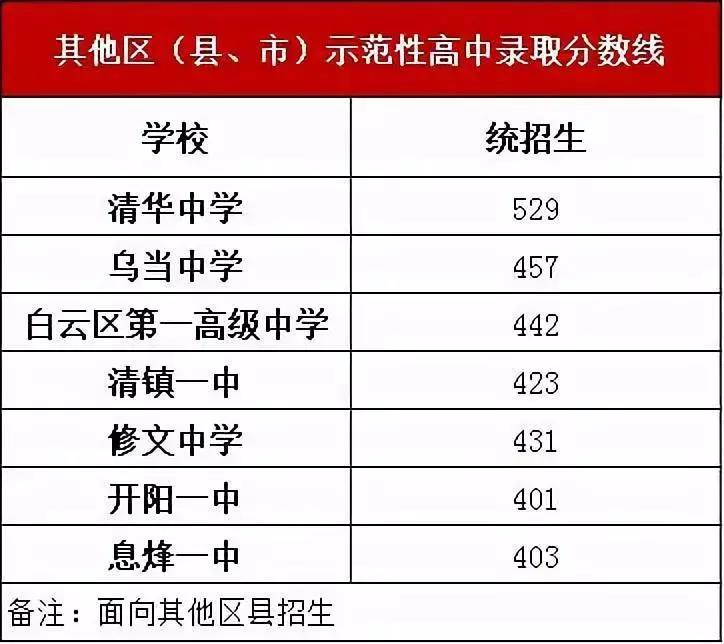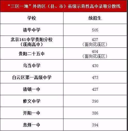 ▍“三区一地”外其他各区(市、县)普通高中招生的最低录取控制线由市招委会按各区(市、县)公办普通高中招生计划的110%(开阳县按105%)划定。各区(市、县) 公办普通高中录取最低控制线分别为:花溪区 293 分,乌当区328分,白云区343 分,清镇市266分, 息烽县 280 分,修文县261 分,开阳县303 分。