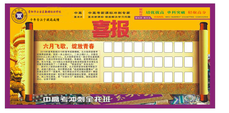 北大铭师堂(隶属于贵阳市云岩区勤渊培训学校)成立于2010年(民办批准文号:252010372019749)。 下设三个业务方向:全日制中高考全托、复读补习5人精品班,初高中各科强化5人精品班,一对一个性化教育中心,年培训高考学生数以千计,强大的师资团队构筑了北大铭师堂学子成就梦想的坚强后盾,形成了今天北大铭师堂鼎立于中高考培训界的知名品牌。