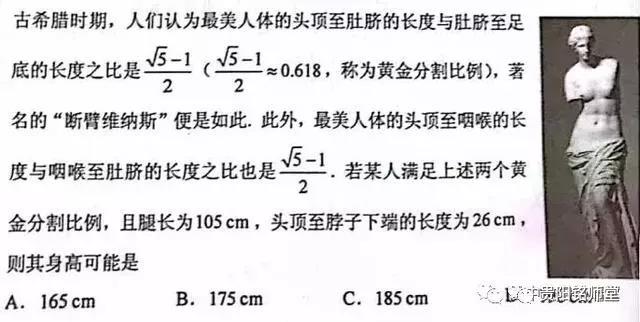 (1)全国卷Ⅰ第4题以著名的雕塑“断臂维纳斯”为例,探讨人体黄金分割之美,卷Ⅱ第16题融入金石文化,将美育教育融入数学教育;