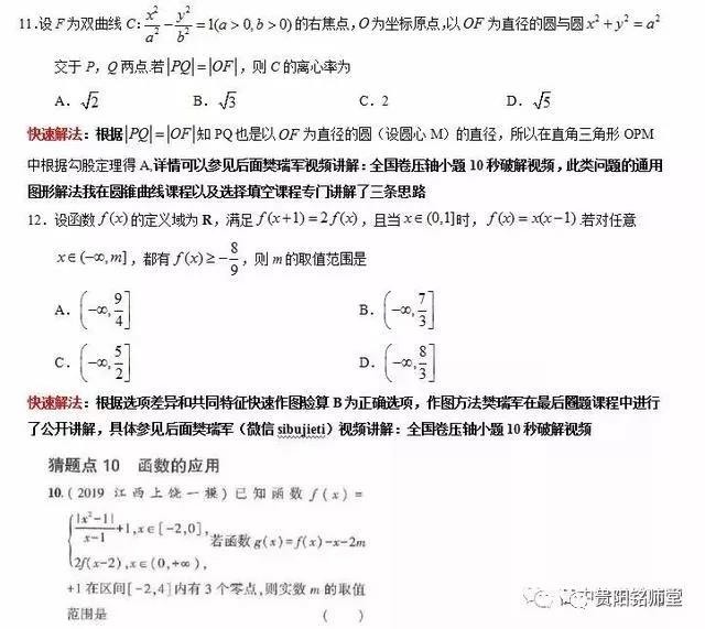 上面这些压轴题目,解题方向都是很明显的,但直接做可能在考场短时间内完不成,所以这就需要一定的结论和套路,这些方法樊瑞军在高考数学圆锥曲线系统课程,高考数学选择填空方法技巧课程都进行了专门的方法讲解。2019压轴小题相关视频讲解参见后续视频讲解