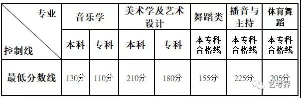 专业合格分数线: 美术类 124分;声乐类 138分;器乐类 130分;舞蹈类 141分;播音与主持艺术 150分 。