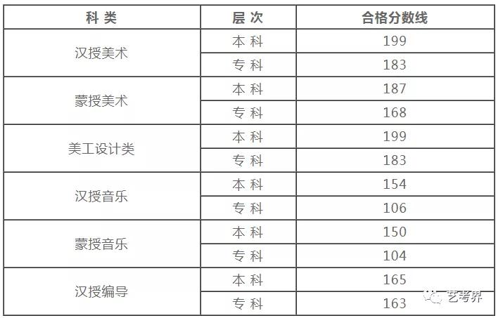 美术类:本科合格线总成绩180分且其中2门科目各不低于60分;高职(专科)合格线总成绩168分;