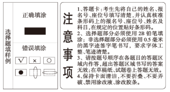 1、在设计印制试卷时,将《试题卷》与《答题卡》分开,考生不在《试题卷》上答题,对试题的作答全部在《答题卡》上进行,也就是说考生答题的所有信息都是通过《答题卡》传递给计算机的。因此,考生一定要按照规定答题,避免因出现信息传递的错误而造成严重的后果!2、认真阅读《答题卡》上的“选择题答题样例”、“注意事项”,做到正确填涂规范答题。