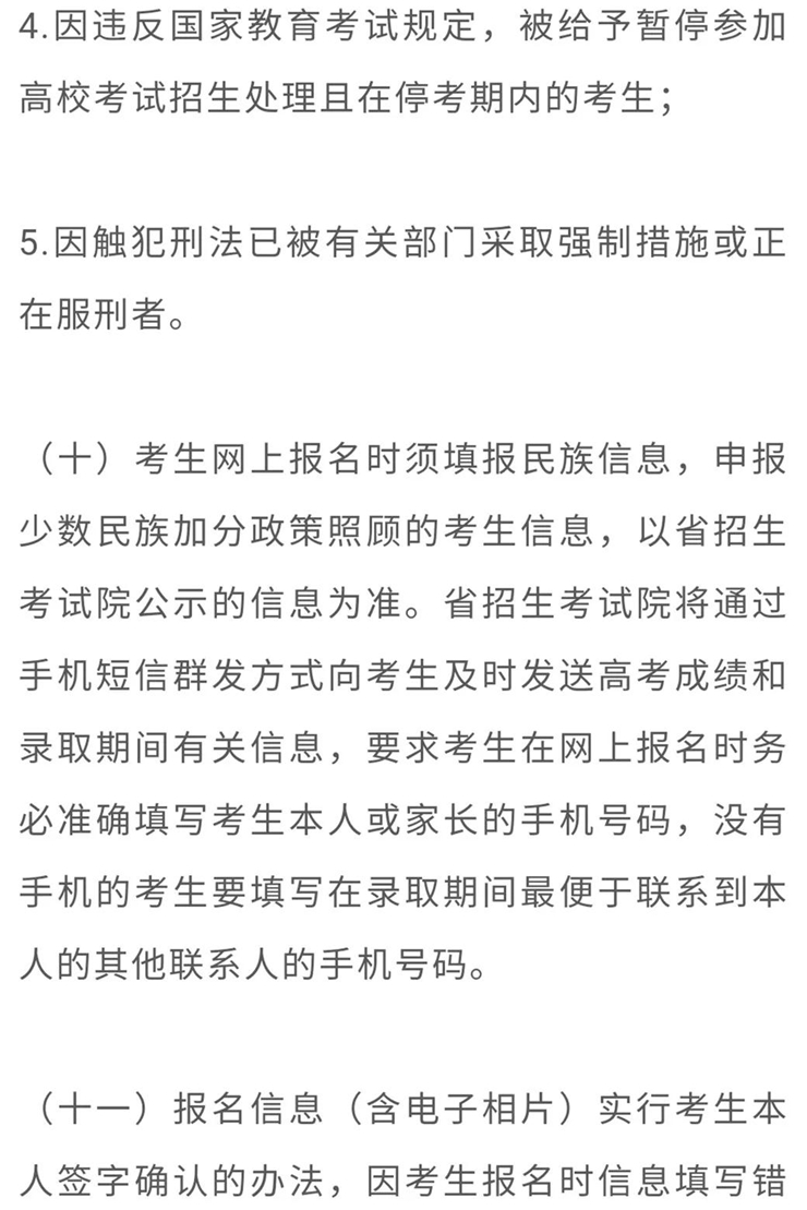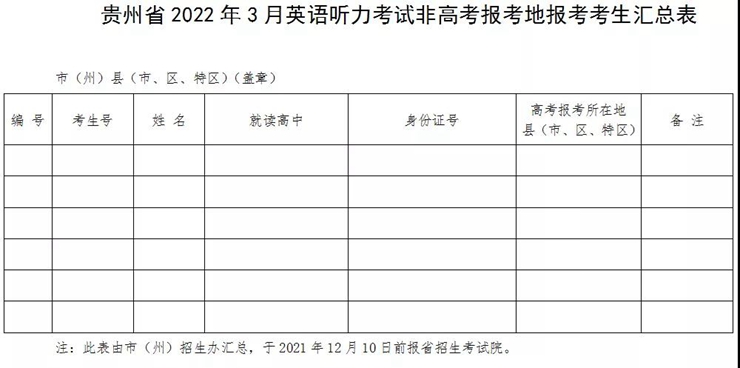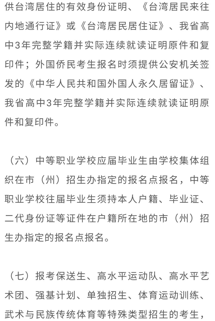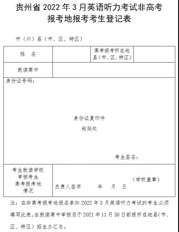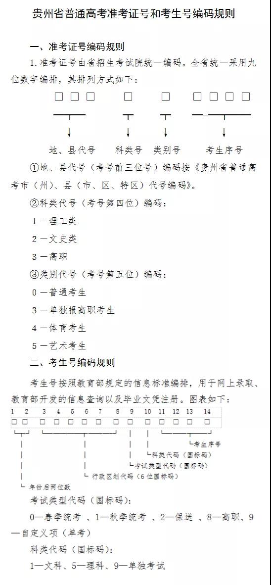 1.2022年贵州省外来人员随迁子女报考普通高等学校实施办法 2.贵州省普通高考准考证号和考生号编码规则 3.贵州省普通高考市(州)、县(市、区、特区)代号编码 4.贵州省普通高考报名电子摄像技术规范 5.贵州省2022年3月英语听力考试非高考报考地报考考生登记表 6.贵州省2022年3月英语听力考试非高考报考地报考考生汇总表 7.残疾考生报考2022年普通高等学校招生全国统一考试合理便利申请表 附件1 2022年贵州省外来人员随迁子女报考普通高等学校实施办法 为贯彻《国务院关于深化考试招生制度改革的实施意见》(国发〔2014〕35 号)中关于“进一步落实和完善进城务工人员随迁子女就学和升学考试的政策措施”精神,根据《省人民政府办公厅关于转发省教育厅等部门贵州省外来人员随迁子女报考普通高等学校暂行规定的通知》(黔府办发〔2012〕63 号)精神,结合我省工作实际,制定本办法。 一、外来人员随迁子女考生符合下列条件之一的,可在我省报名参加高考,且不受报考批次的限制 (一)在我省取得初中毕业证书,高中阶段在我省连续就读三年,有我省高中阶段三年完整学籍。考生高考报名前,其父亲(或母亲)在我省居住,有合法稳定住所、合法稳定职业,持有我省居住证(依据:国务院《居住证暂行条例》和公安部令第148号《公安部关于废止<机动车号牌生产管理办法>和<暂住证申领办法>的决定》)和在我省连续缴纳社会保险均在三年以上(含三年); (二)考生父亲(或母亲)系经我省县级以上(含县级)组织、人力资源社会保障部门批准,按程序调入我省党政机关、事业单位工作,考生户籍在高考报名前迁入我省,高中阶段在我省就读,有我省高中阶段学籍; (三)考生父亲(或母亲)系高级职称或者博士学位的专业技术人才,经我省县级以上(含县级)组织、人力资源社会保障部门审批同意,引进到我省党政机关、事业单位工作,考生户籍在高考报名前迁入我省,高中阶段在我省就读,有我省高中阶段学籍; (四)考生父亲(或母亲)系经我省市(州)级以上(含市、州)组织、人力资源社会保障部门认定引进的高层次创新创业人才,在我省连续工作二年以上(含二年),考生户籍在高考报名前迁入我省,高中阶段在我省连续就读二年以上(含二年),有我省高中阶段二年学籍; (五)考生父亲(或母亲)系由部队转业(复员)安置到我省,考生和父亲(或母亲)户籍迁入我省,在我省高中学校就读,有我省高中阶段学籍; (六)考生父亲(或母亲)按程序调入我省国有企业工作,考生和父亲(或母亲)户籍迁入我省,高中阶段在我省就读,有我省高中阶段学籍; (七)考生和父亲(或母亲)在我省有常住户籍,考生高中阶段在我省连续就读三年,有我省高中阶段三年完整学籍; (八)考生本人户籍迁入我省六年以上(含六年),有我省初中阶段三年完整学籍、高中阶段三年完整学籍; (九)考生本人小学一年级到高三年级在我省学校有学籍并连续在我省就读满12年。同时,在我省小学、初级中学和普通高中学校毕业,其父亲(或母亲)在我省有合法稳定的住所(含租赁)和合法稳定的职业。 二、外来人员随迁子女考生不符合上述规定条件,按以下方式办理 (一)考生户籍已迁入我省,有我省高中阶段学籍并连续就读满2年的(从考生高中毕业时间往前推算),可以在我省报考第二批本科院校(含提前批本科院校中按第二批次分数线录取的院校)和高职(专科)学校。 (二)考生户籍已迁入我省,无我省高中阶段学籍或高中阶段学籍不满2年的(从考生高中毕业时间往前推算),可以在我省报考高职(专科)学校。 (三)考生在我省取得初中毕业证书,高中阶段在我省连续就读满3年,有我省高中阶段3年完整学籍。考生高考报名前,其父亲(或母亲)在我省居住,有合法稳定住所(含租赁)和合法稳定职业,持有我省居住证和在我省缴纳社会保险均在二年以上(含二年),不满三年的,可以在我省报考第二批本科院校(含提前批本科院校中按第二批次分数线录取的院校)和高职(专科)学校。 (四)考生户籍未迁入我省,但有我省高中阶段学籍的,原则上要求考生回户籍所在地报考,也可以在我省申请报考高职(专科)学校。 三、外来人员随迁子女考生在我省报名参加高考,须按要求提供相关证明材料 (一)符合本办法第一条(一)至(八)项报考条件的考生,报考时,应按照《省人民政府办公厅关于转发省教育厅等部门贵州省外来人员随迁子女报考普通高等学校暂行规定的通知》(黔府办发〔2012〕63号)要求提供相关证明材料。 (二)符合本办法第一条第(九)项报考条件的考生,报考时,考生需提供本人居民身份证、小学就读学校证明(县级教育局审核盖章)、初中毕业证书、高中毕业证书(应届考生提交所在学校出具的毕业证明)、贵州省初中学生学籍登记表、贵州省普通高中学生学籍登记表、贵州省普通高中学生花名册、父亲(或母亲)在我省一年以上的住房证明(房屋使用权证明或购房合同、房屋租赁合同等)和务工证明。 考生资格审核监督、公示及责任追究等规定,按《省人民政府办公厅关于转发省教育厅等部门贵州省外来人员随迁子女报考普通高等学校暂行规定的通知》(黔府办发〔2012〕63号)执行。 附件2