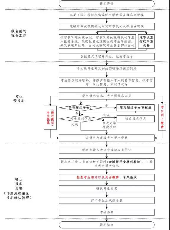 从高考报名流程图我们可以发现,其实无论是应届生、复读生,还是社会考生,报名流程都是一样的,区别就在于: 应届生一般是学校办理集体报考手续,所以不用担心; 复读生需要自行去户口所在地招办领取考生号→网上报名→自行前往户口所在地招办进行现场确认。 1、报名流程(2022年参考) 说明:下文信息全部基于2021年的高考报名通知,仅供参考. 高考报名采取网上报名和现场确认的方式,报名流程如下: 1.领取考生号和初始密码。 报名前,考生应事先准备符合我省报考资格的相关证明材料,到报名点领取本人的考生号及上网初始密码。应届毕业生原则上在学籍所在地报考,报名点一般为所读的中学;往届毕业生和高中阶段户籍从外省迁入我省的应届生在户籍所在地报考,报名点一般为本人户口所在的县(市、区)招生办公室。 2.网上预报名。 网上预报名期间,考生通过考生号及初始密码登录高考报名系统进行网上报名。网上报名时,考生须认真阅读报考须知,签订《考生诚信考试承诺书》,并按系统指引,录入本人的基本信息(含报考信息、简历信息、家庭情况等),绑定个人手机,采集和上传相片,并交纳报考费。 简要流程图如下: